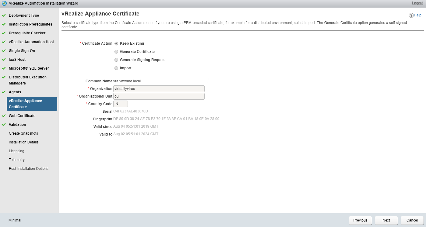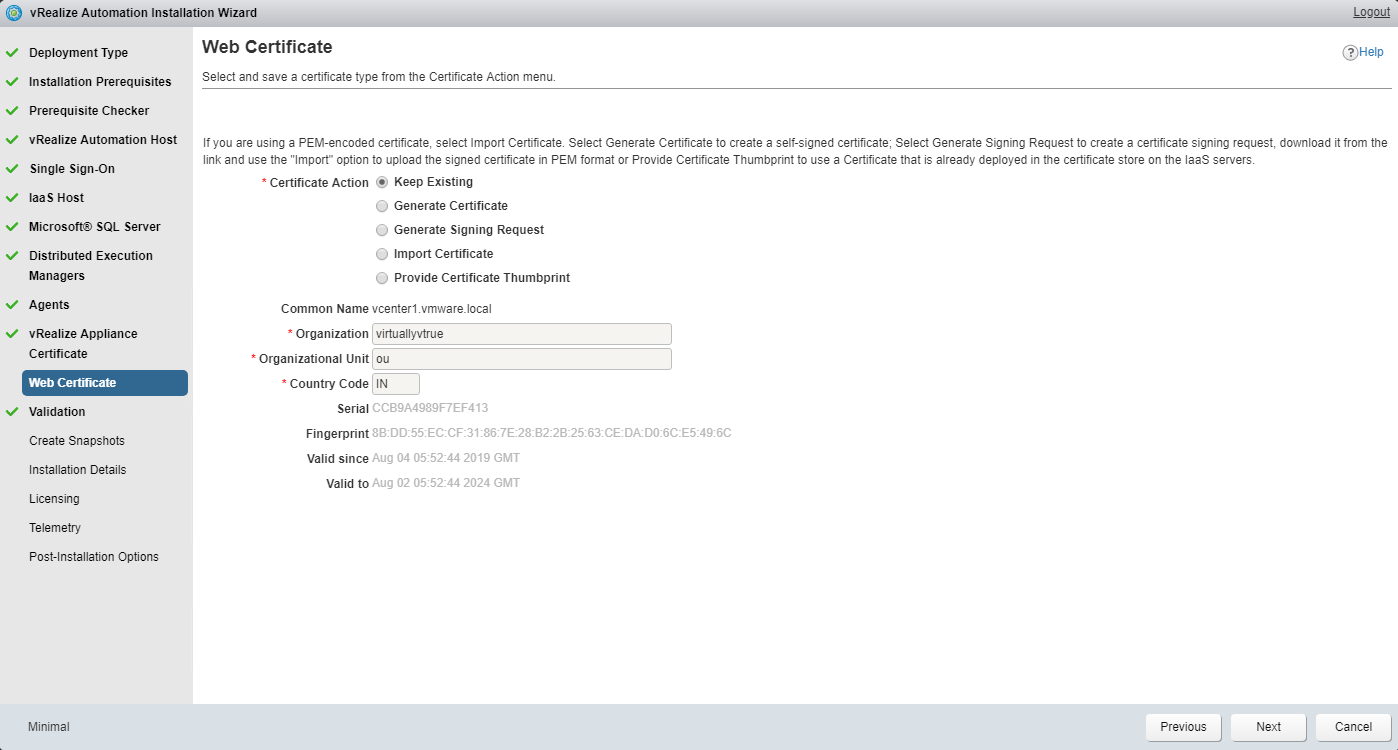 For vRA certs, you can keep the default certs or select Generate certificate and enter your Organization details etc and a new self-signed cert will be installed on vRA host.