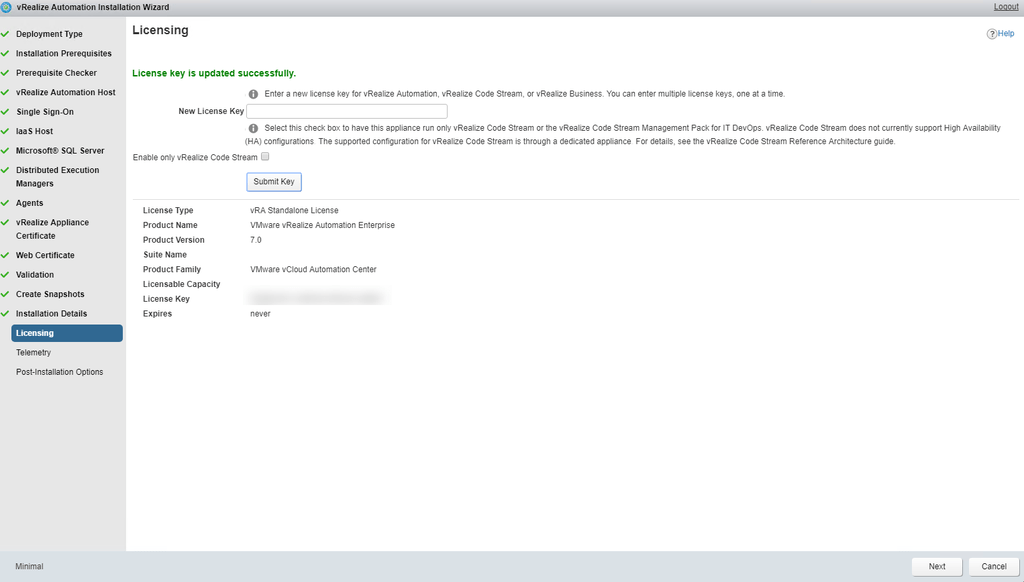 Click next and enter your vRA License Key and again click Next.