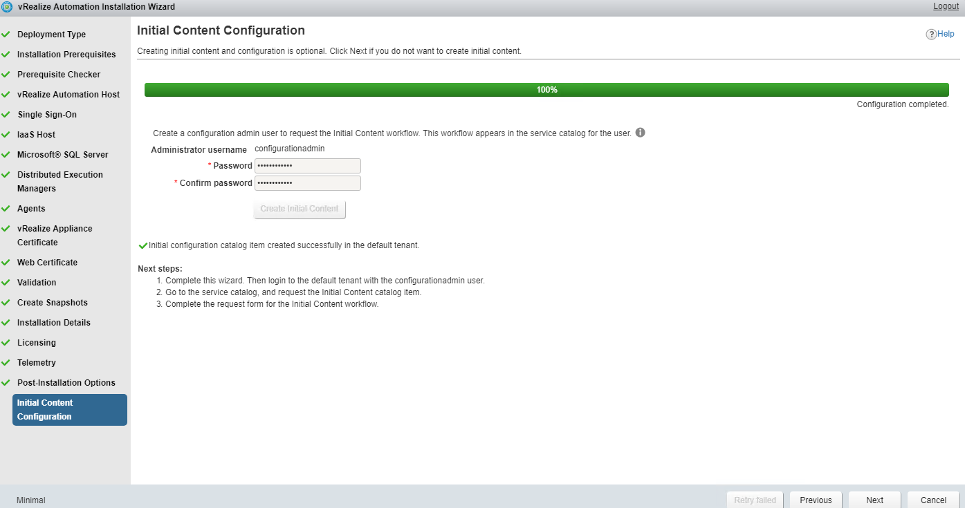 Post installation is completed you can go with request initial content. This option configures the initial Tenant content where a configuration admin is created and XaaS service is installed which will walk you through setting up initial tenant logic.