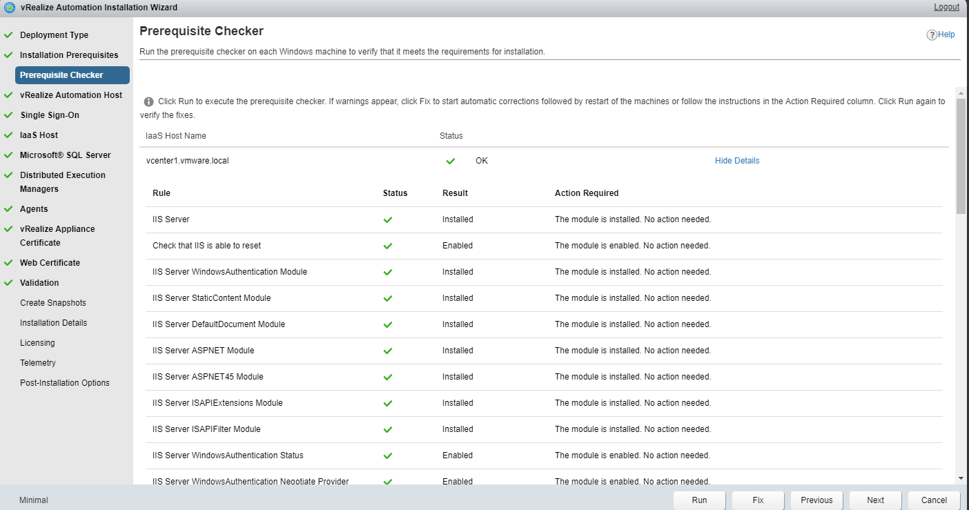 You don’t have to manually fix the missing items . Just hit the fix button to push the missing configurations on IaaS host. Once the installation wizard has pushed all the updates to each IaaS node, the checks will be run once again automatically. At this point you will see the status as OK.