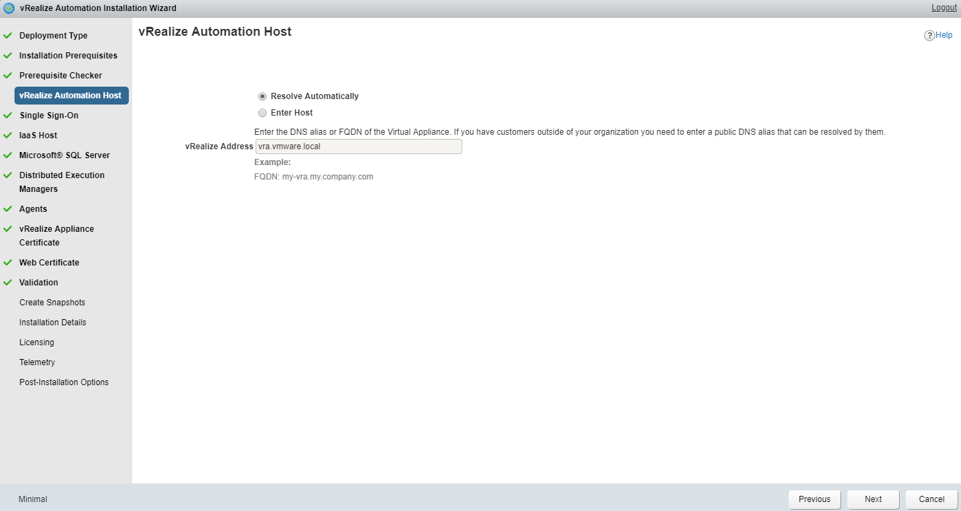 For vRA host, click on Resolve automatically or enter the FQDN manually.