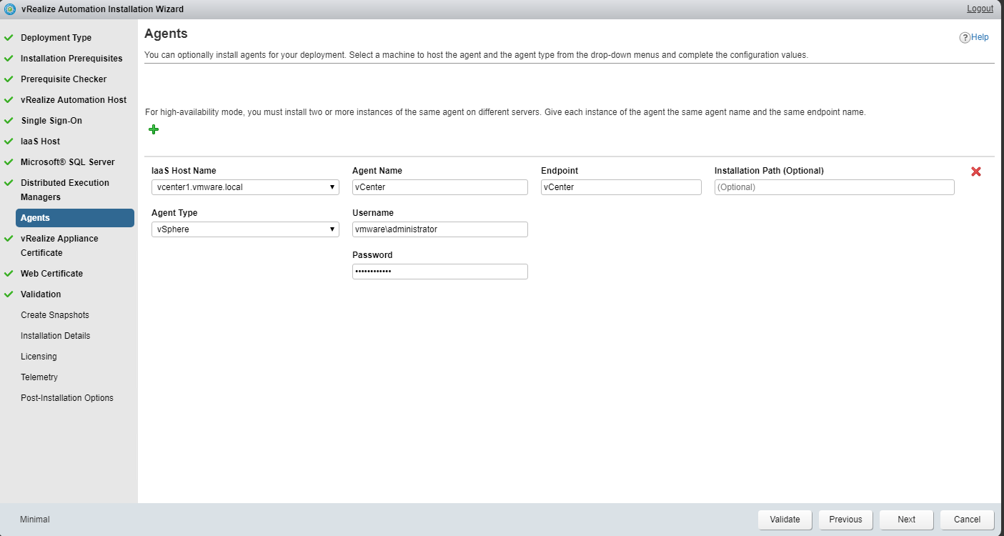 The installation wizard installs and configures the initial agents…typically for vSphere/vCenter endpoints. Additional agents (for other platforms) can be installed separately.