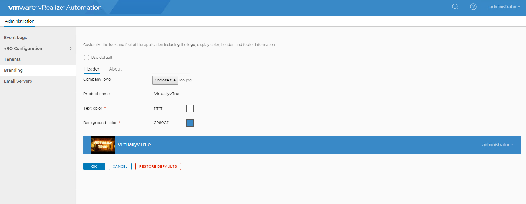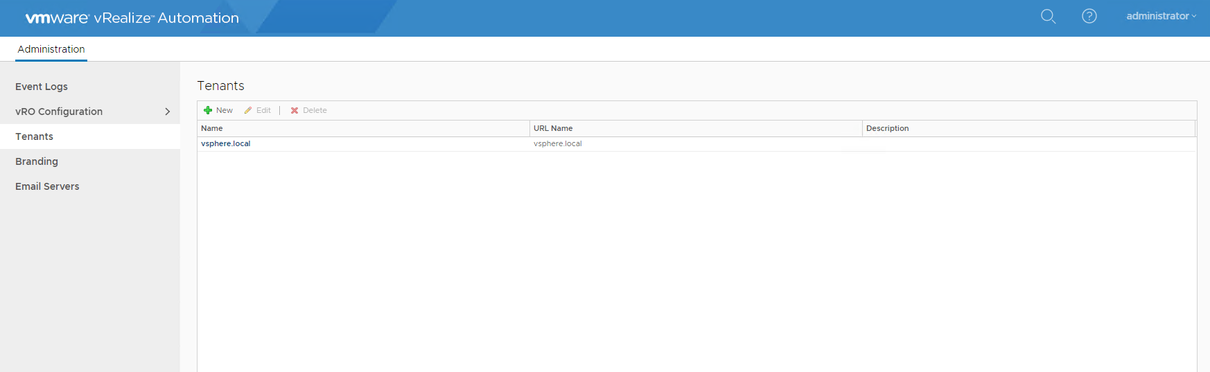 Once you are done with branding your vRA instance, navigate to Administration -> Tenants. Select the default tenant and click on edit button.