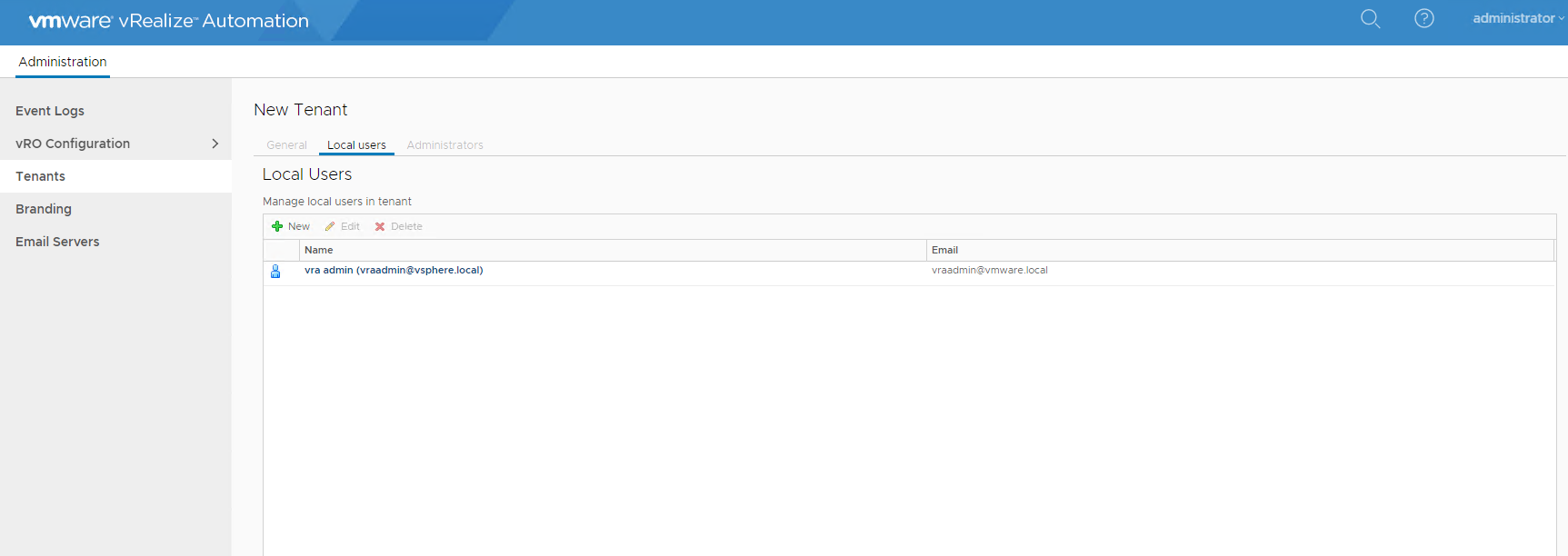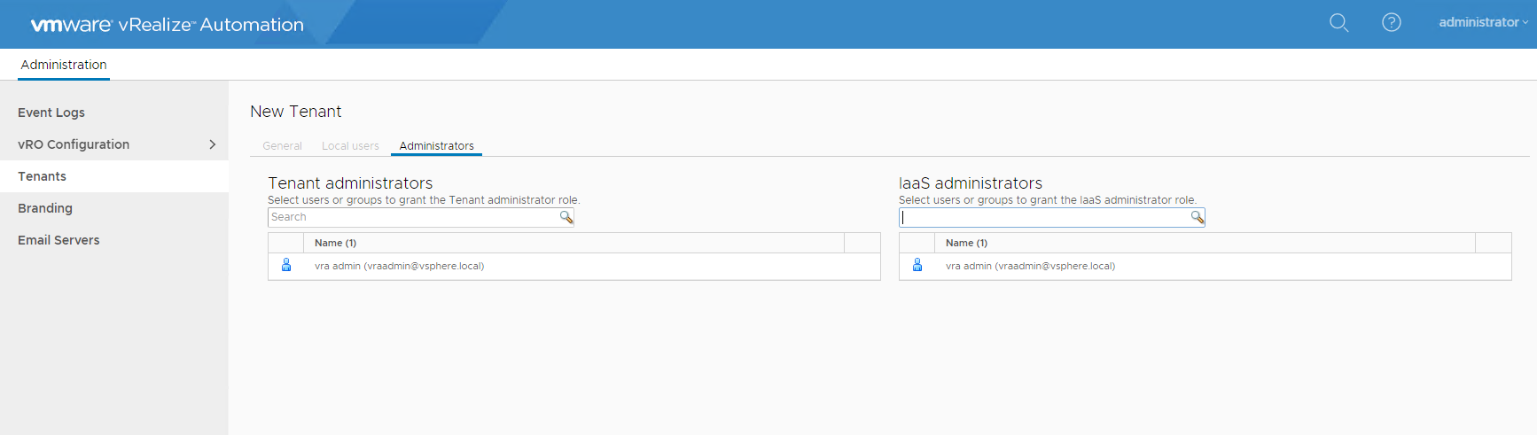 Navigate to administrator’s tab and add the local user under Tenant administrator and IaaS administrator.