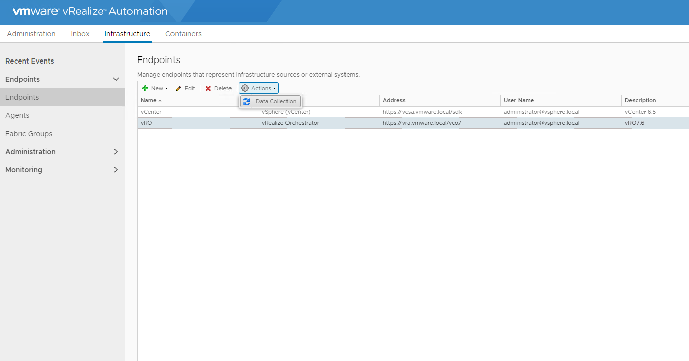 Select the vRO endpoint and from actions tab, click on Data Collection. Data collection is the process where vRA reaches out to its infrastructure source endpoints and their compute resources to collect information.
