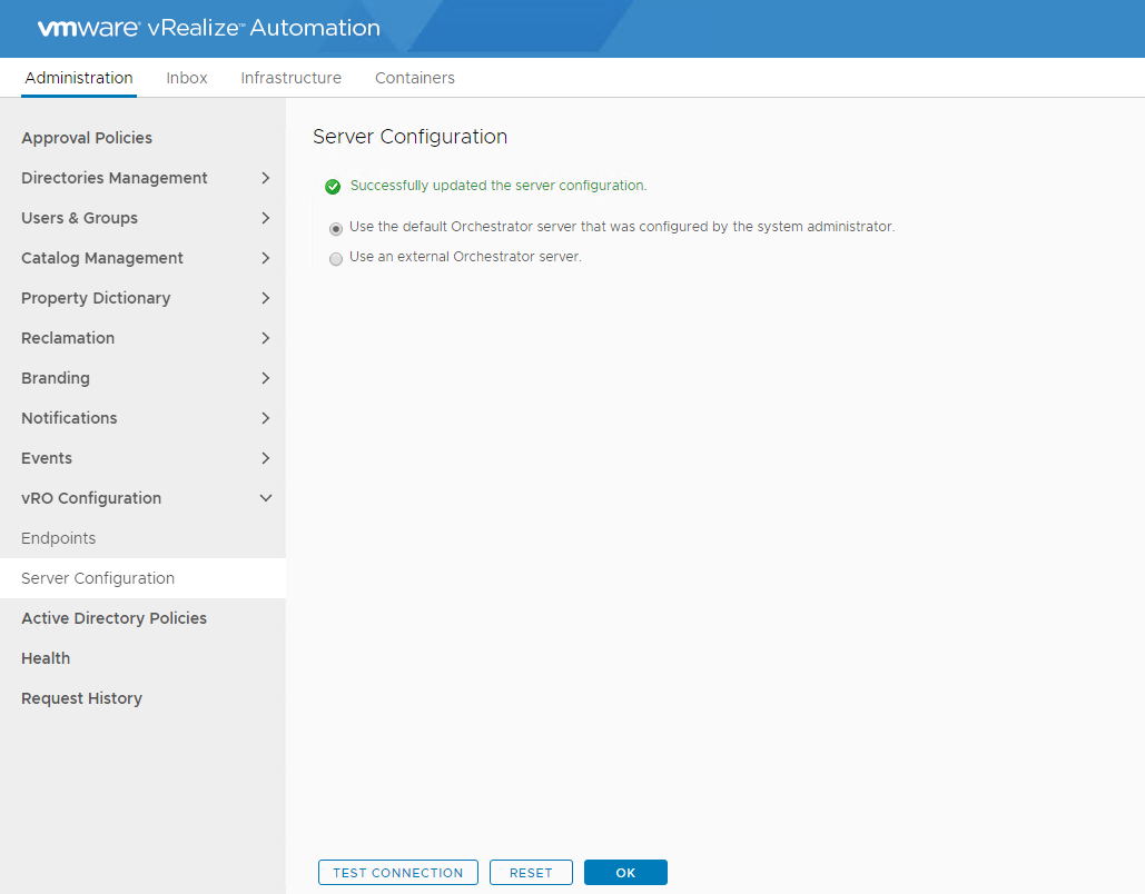3. To configure embedded vRO, navigate to Administration > vRO Configuration > Server Configuration and select “Use the default Orchestrator server” and click on Test connection.