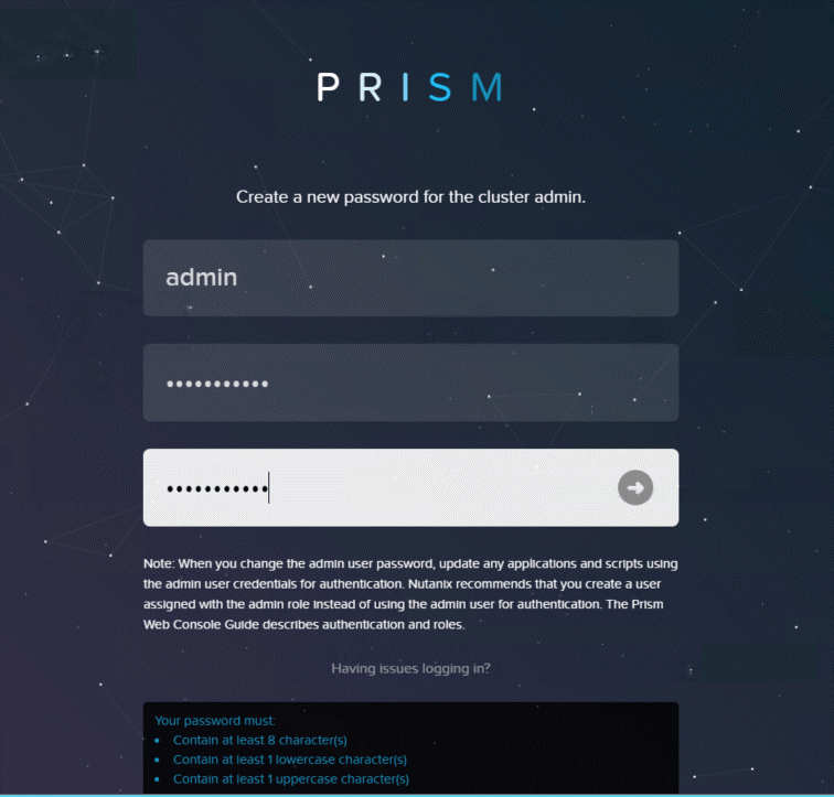 Post install connect to Prism https://<CVM-IP>:9440 and login with admin user and nutanix/4u as password.
