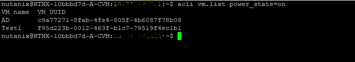 for vm_name in `acli vm.list power_state=on | grep -v ^'VM