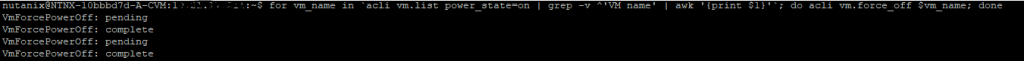 name' | awk '{print $1}'`; do acli vm.force_off $vm_name; done