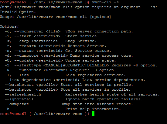 ==================== root@vcsa67 [ /usr/lib/vmware-vmon ]# vmon-cli -S AUTOMATIC -U netdumper Completed Service State Update request. root@vcsa67 [ /usr/lib/vmware-vmon ]# vmon-cli -s netdumper Name: netdumper Starttype: AUTOMATIC RunState: STOPPED RunAsUser: netdumper CurrentRunStateDuration(ms): 951200958 HealthState: UNHEALTHY FailStop: FALSE MainProcessId: N/A root@vcsa67 [ /usr/lib/vmware-vmon ]# ====================