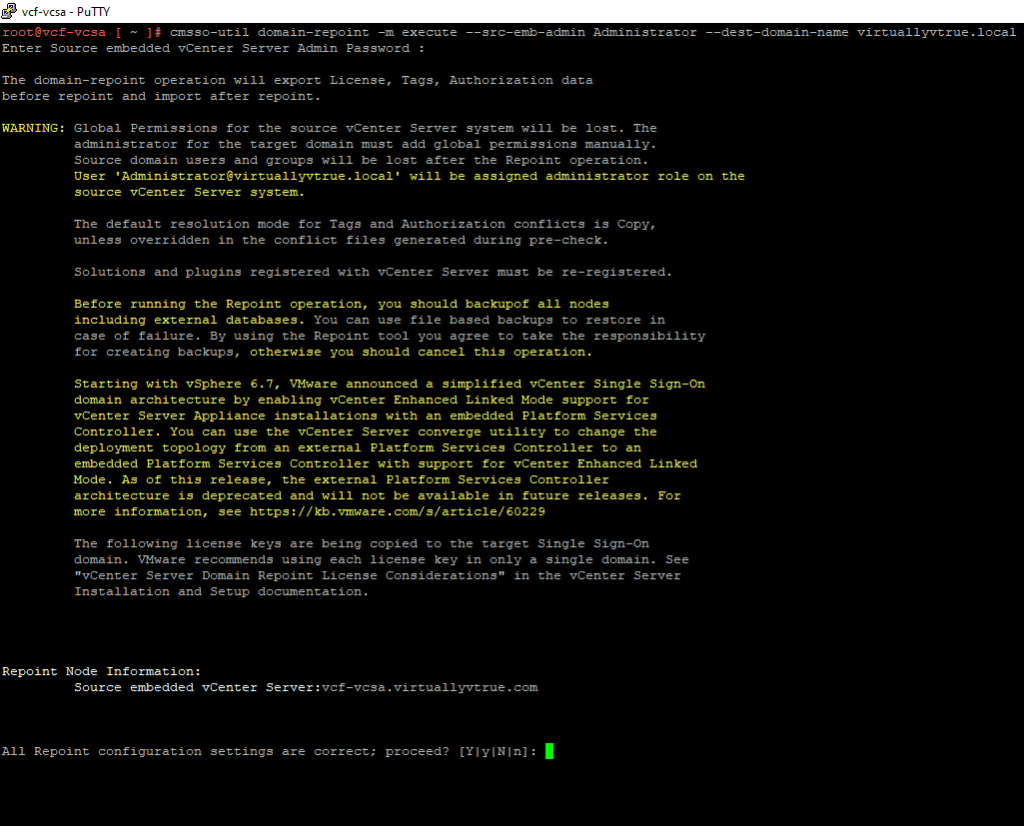 cmsso-util domain-repoint -m execute --src-emb-admin Administrator --dest-domain-name virtuallyvtrue.local