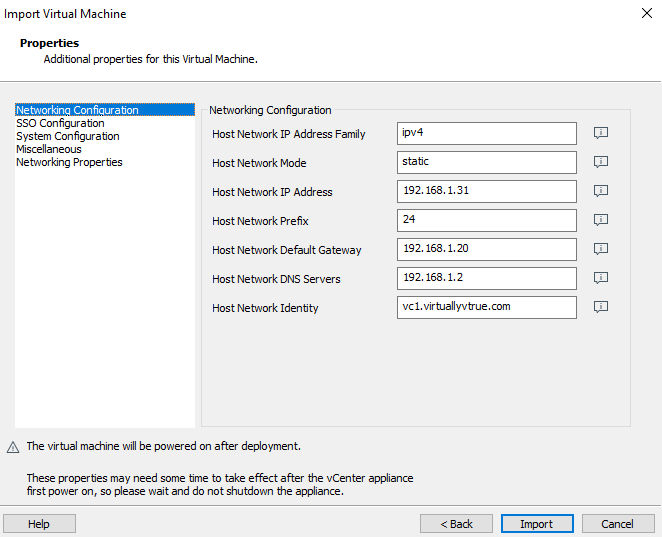 All the properties provided above will need some time to take effect after the vCenter appliance first power on, so just wait and do not shutdown the appliance. Let vCenter server virtual appliance initiate and wait for DCUI to appear to confirm all is going good.