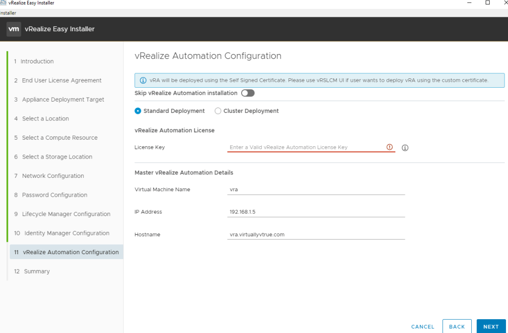 At the vRealize Automation Configuration page, ensure that the Skip vRealize Automation Installation toggle is off. Select the Standard Deployment option and enter the License Key for vRealize Automation 8. Then, using information for the vRealize Automation 8 Appliance, enter the Virtual Machine Name, the IP Address and (finally) the Hostname (FQDN).