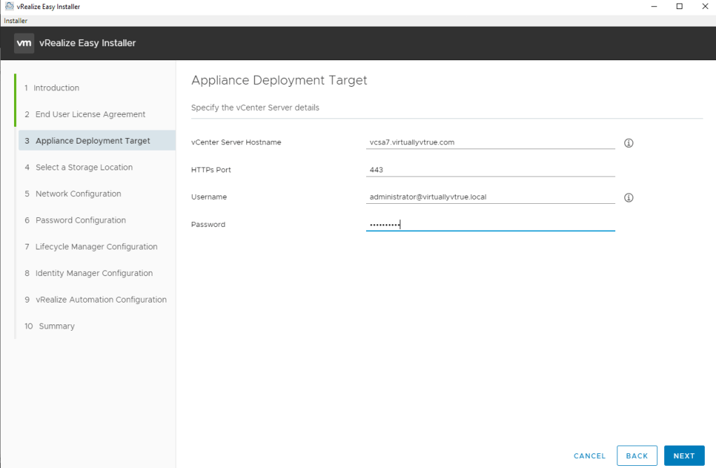 At the Appliance Deployment Target page, enter the vCenter Server Hostname, the HTTPS Port, the Username to connect to the vCenter Server and finally the Password for the user. Click Next.