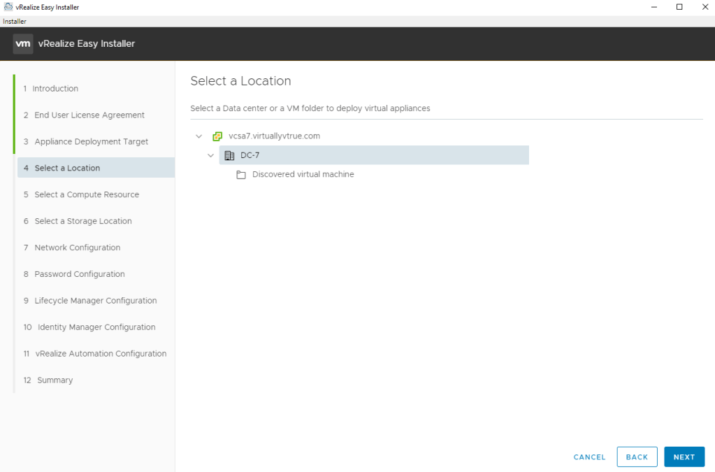 At the Select a Location page, select the target location (DataCenter or Virtual Machine Folder) within the vCenter Server.