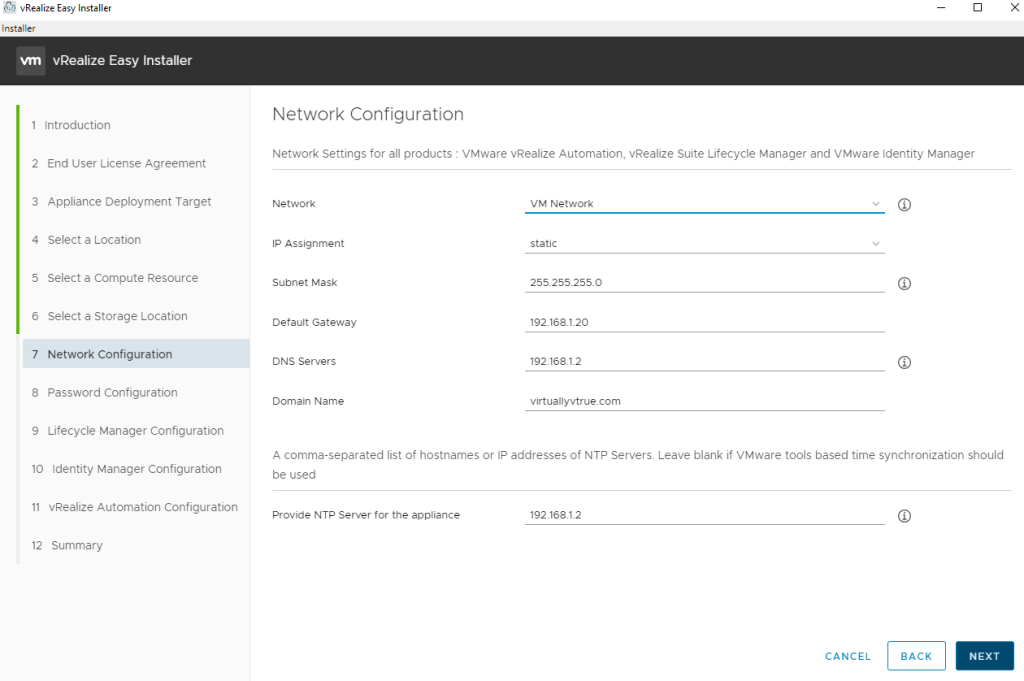 At the Network Configuration page, select the target network from Network dropdown, enter the Subnet Mask, the Default Gateway address, the address for the DNS Servers, the Domain Name and, finally, the NTP Servers.