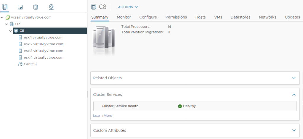 - Healthy – The vCLS health is green when at least 1 agent VM is running in the cluster. To maintain agent VM availability, there’s a cluster quorum of 3 agent VMs deployed.