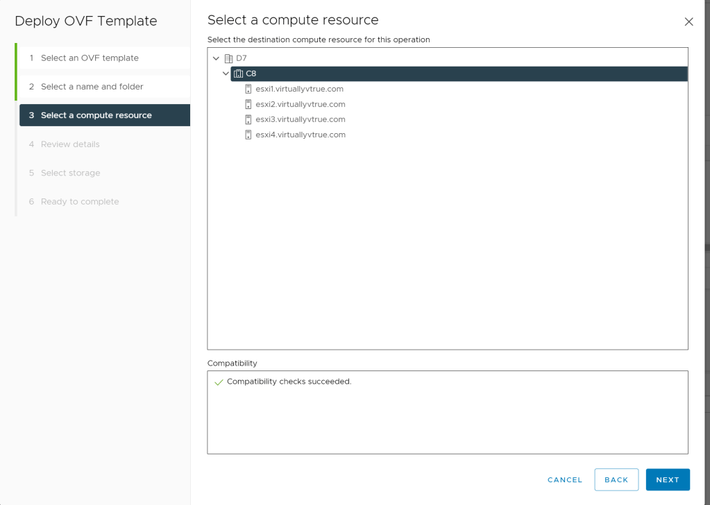 Select a name for the KMS server and folder where to place the new VM. Now select a Compute Resource, in my case I select cluster C8 itself.