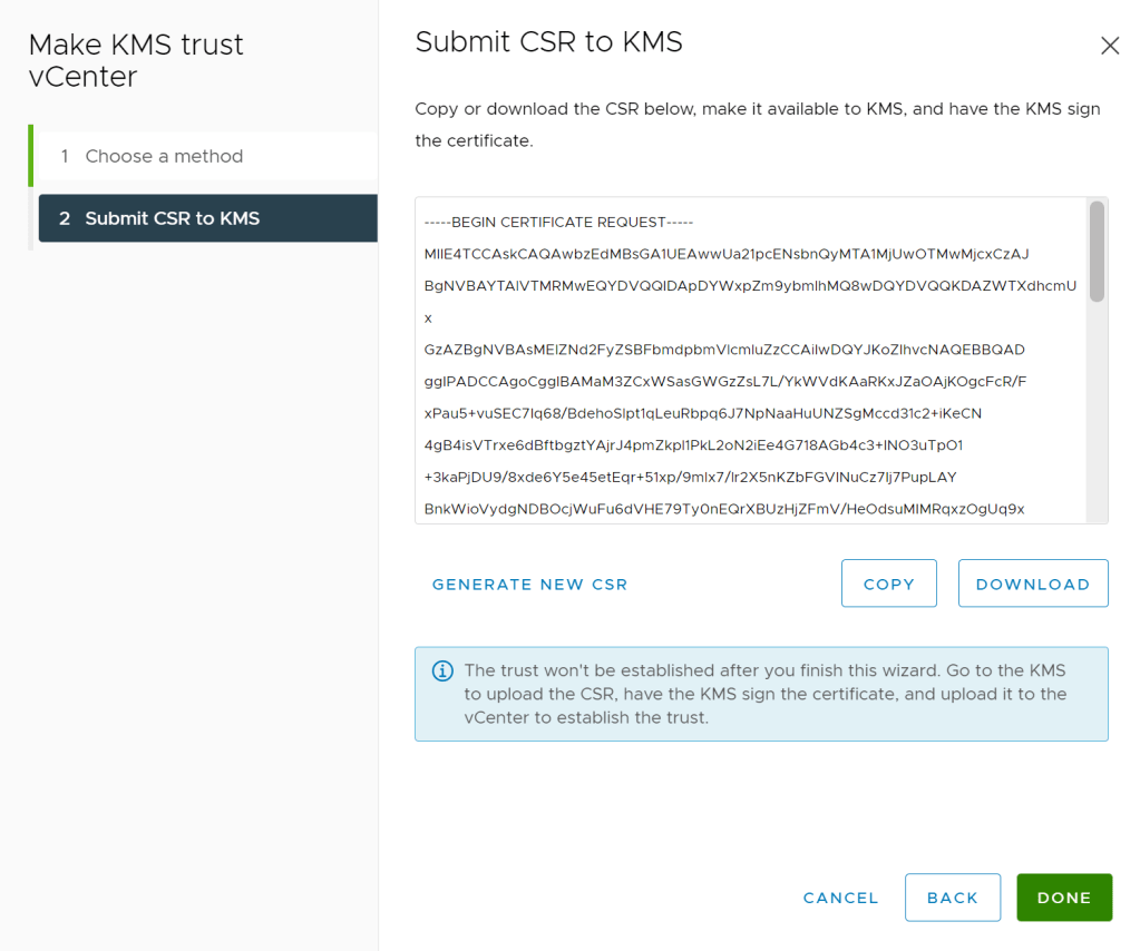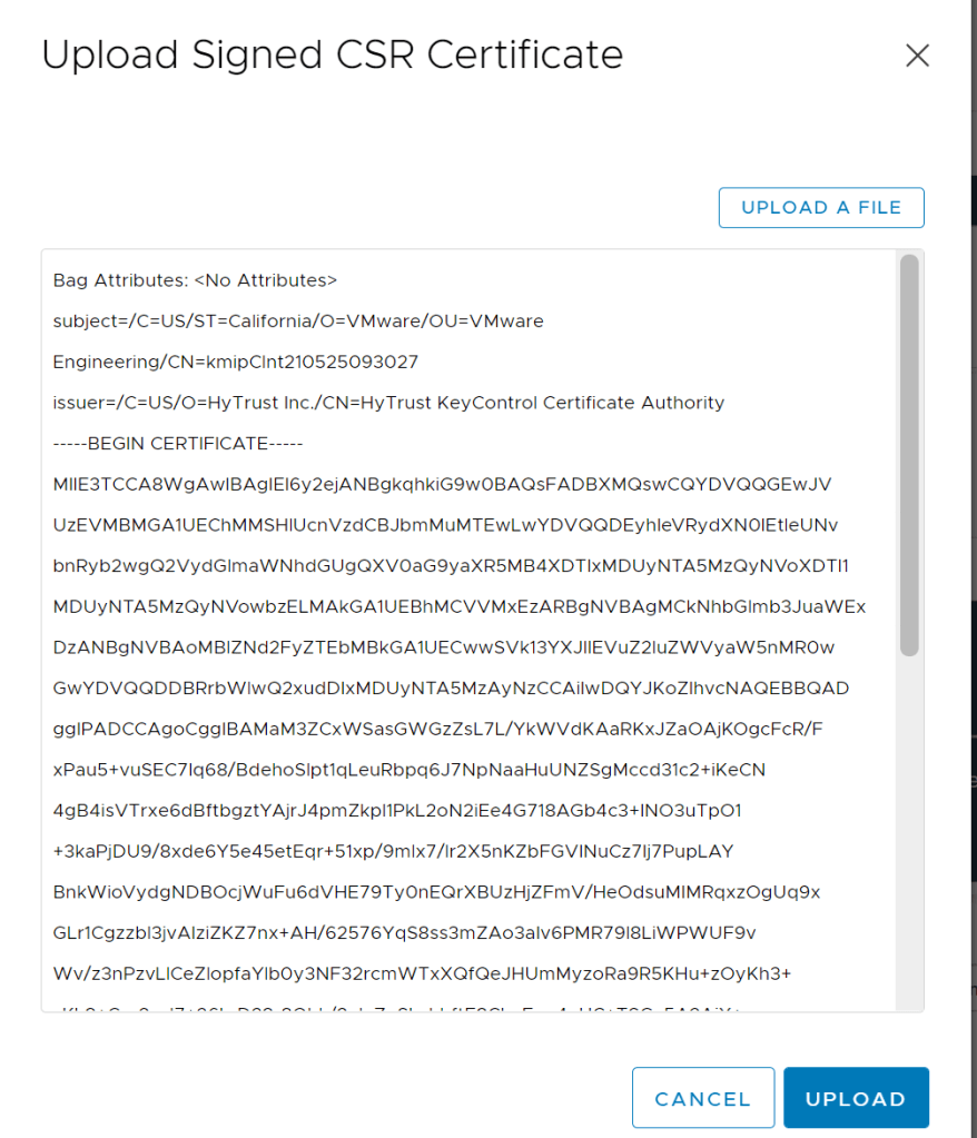 In vCenter click the Upload Signed Certificate link and select the VCSA.pem file from the HyTrust KMS server. And press UPLOAD.