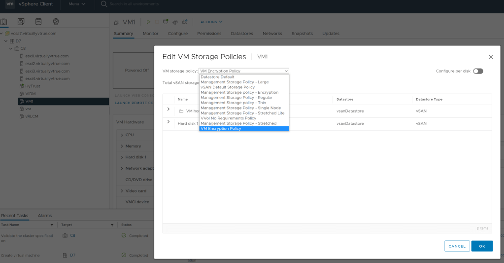 After configure the KMS Solution with the Vcenter you can start using the Vsphere Storage Policy to convert the VM’s Disk to be Encryption.