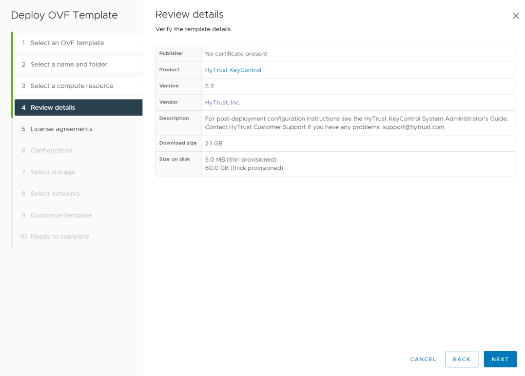 As soon as you press Next on step 3 of the deploy wizard it will load the OVF and switches from an original 6 steps deployment to a 10 step deployment after reading the OVF content. Review the details about the appliance (OVA) you are about to deploy.