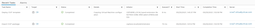 Review all settings on the Ready to complete step and press the Finish button. It will start two tasks in vCenter named Deploy and Import OVF. Wait till they finish successfully, before moving to the next step.