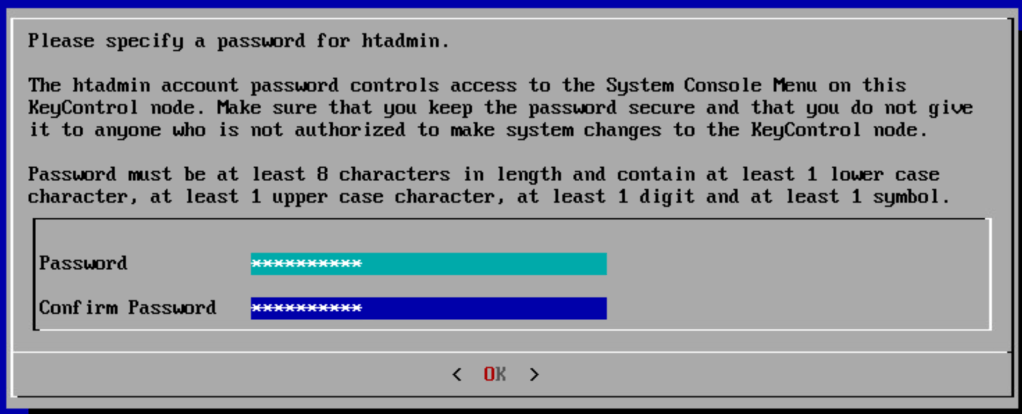 Power on the newly deployed KMS server. It will ask you to specify a password for the htadmin account. Enter a new password for htadmin and press OK.