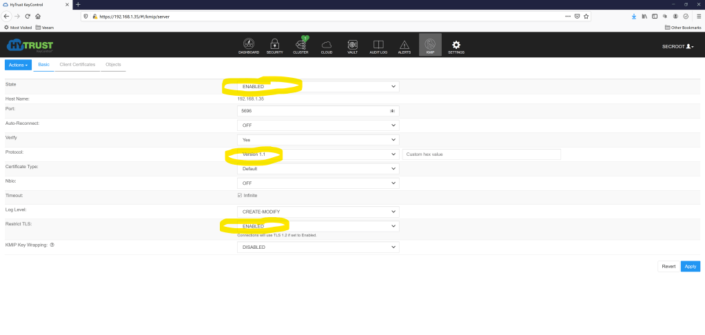 Select KMIP in the top banner bar. Go to State and put it on Enabled. Then open Protocol and select Version 1.1 from the drop-down list. As a final go to Restrict TLS and select Enabled to make sure traffic is on the TLS 1.2 protocol. Click the Apply button now to apply the new settings.